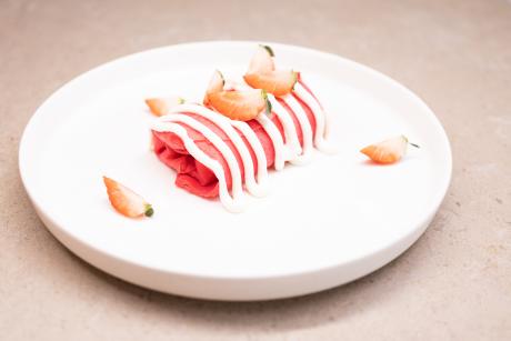 Вівсяна каша на молоці з сумішшю насіння (льон, гарбузове, соняшникове, чіа) у поєднанні з хрусткою гранолою та соусом з полуниці