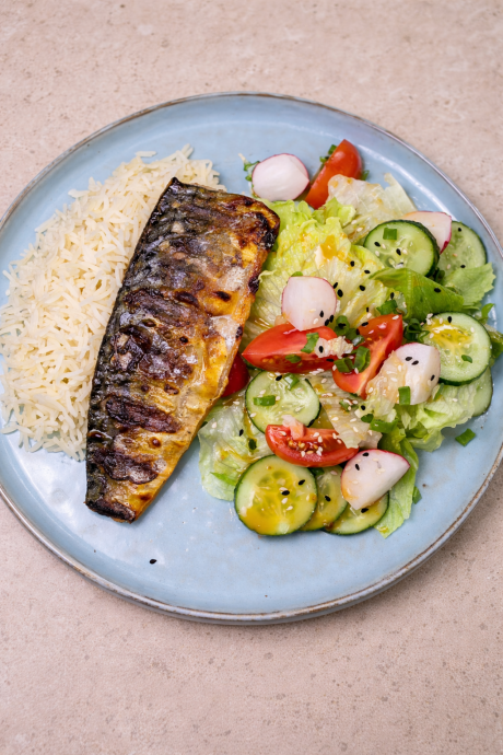 Лосось, салат мікс, авокадо, чері, огірок, кіноа, соус спайс, соус кисло-солодкий (пікантний), тобіко оранж