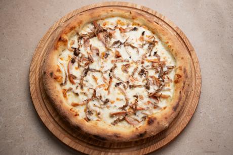 Тісто на заквасці, соус часниковий, гливи смажені, стегно куряче смажене, сир моцарела.