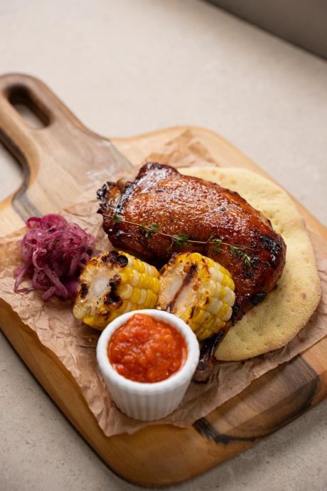 Куряча ніжка глазурована у фініковому сиропі, піта, кукурудза гриль, аджика власного приготування, цибуля маринована.