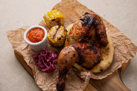 Половинка курчати маринована у спеціях з додаванням фрешу лайму запечена у хоспер печі, піта, аджика власного приготування, цибуля маринована, кукурудза гриль.