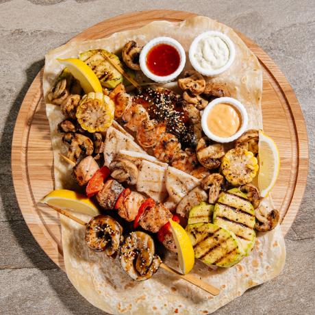 Тигрові греветки, філе скумбрії, філе дорадо, рожевий кальмар, філе лосося, перець болгарський, печериці гриль, кукурудза гриль, кабачок гриль, лафа, соус спайс, соус тар тар, соус кисло-солодкий
