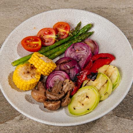 Аспагарус, кабачок, печериці, кримська цибуля, болгарський перець, кукурудза та соус