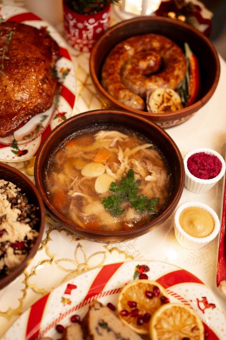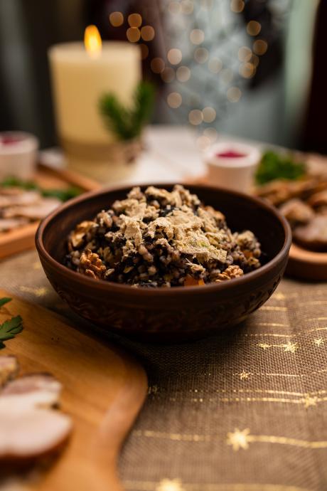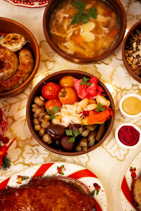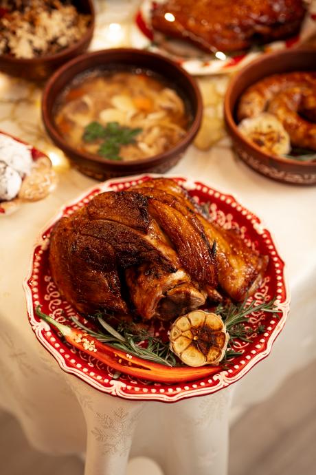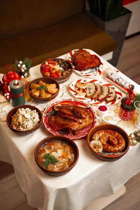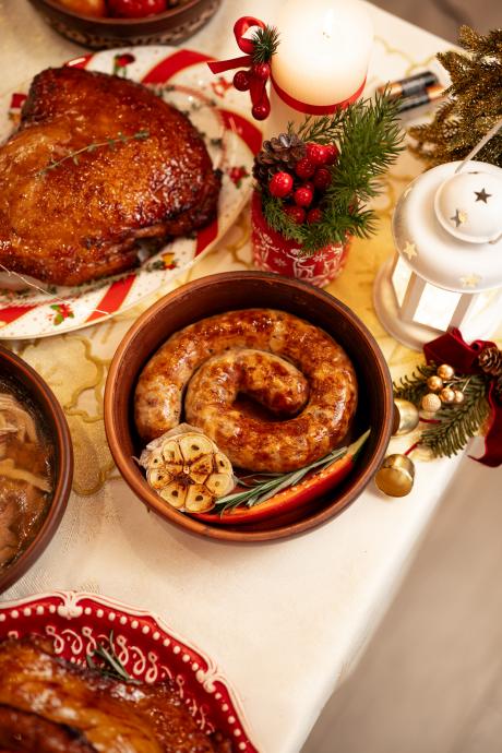 Рулька глазурована - 1 шт, сувідоване індиче стегно - 1 шт, холодець з домашньої птиці - 500 г, олівʼє - 500 г, асорті з солінь - 550 г, домашня ковбаса зі свинини - 350 г, короп фарширований - 350 г, голубці тушковані свино-яловичі 500 г, кутя ( пшениця, мак, вишня, горіх грецький, курага, родзинки, журавлина, фісташкова халва)- 400 г, шоколадна ковбаса - 2 шт, хрін 100 г, гірчиця 100 г.
