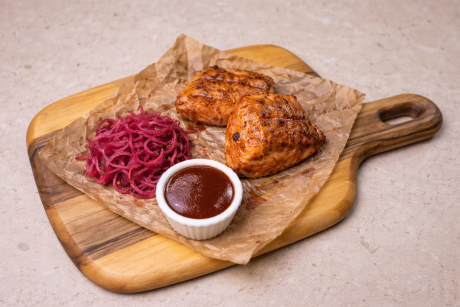 Свинний ошийок маринований у спеціях та приготовлений у хоспер печі, цибуля маринована, соус барбекю власного приготування