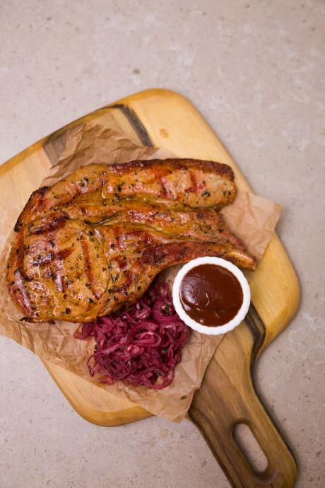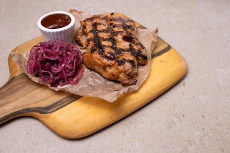 Стейк зі свинини приготовлений у хоспер печі, цибуля маринована, соус барбекю власного приготування.