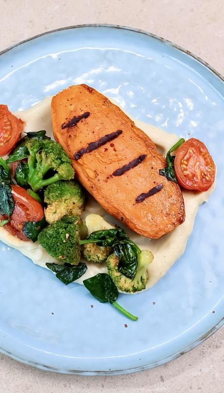 Батат смажений в хоспері, крем з цвітної капусти на кокосових вершках, шпинат бебі, чері, цибуля порей.
