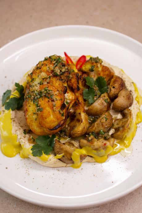 Стейк з цвітної капусти приготовлений у хоспері, печериці гриль, подушка з хумусу, соус тахіні, кінза.
