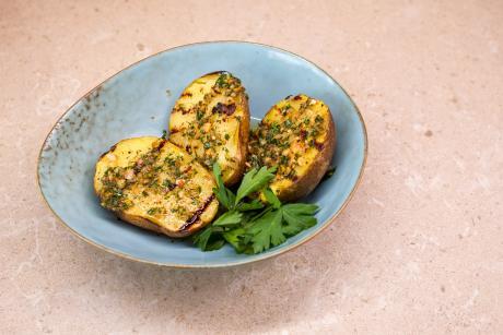 Картопля запечена в хоспері, заправлена зеленню, домашньою ароматною олією та часником, мікс горіхів