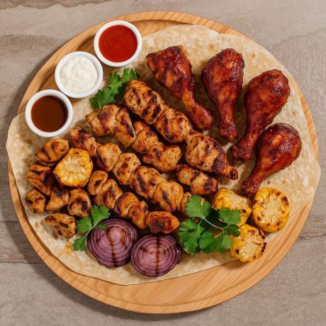 Філе індика (прикрашається кунжутом), куряче стегно в спеціях хайфа, філе куряче, свинина, 4 курячі ніжки, лафа, цибуля синя гриль, печериці гриль, кукурудза гриль, соус демігляс, соус тар тар, соус макбуха (томатний червоний)