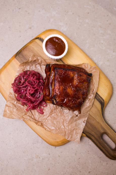 Ребра зі свинини глазуровані приготовлені в хоспер печі, цибуля маринована, соус барбекю власного приготування.
