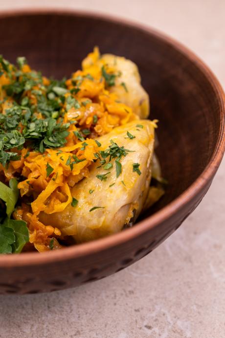 Гарбуз, морква, цибуля, кокосове молоко, імбир, житні сухарики, прошуто