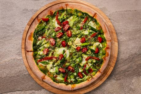 Соус шпинатний, моцарела, кабачок, капуста броколі, шпинат бебі, болгарсьй перець маринований, чері, пармезан, соус песто.