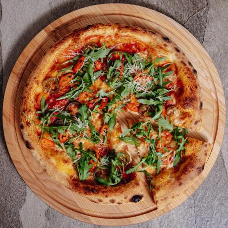 Соус маринара, соус шрірача, ковбаса чорізо, перець халапеньйо, перець чилі, сир пармезан, рукола, сир моцарела