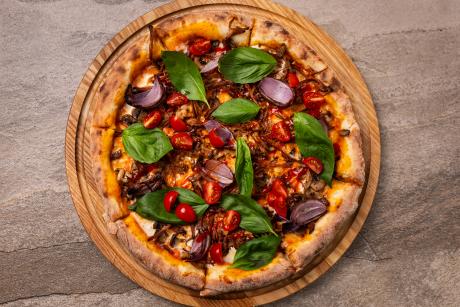 Томатний соус, моцарела, томлена телятина, смажені печериці, запечена синя цибуля, чері, базилік свіжий, соус шрі-рача.