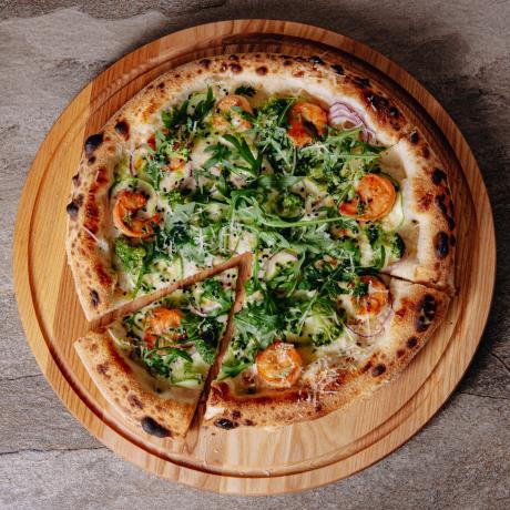 Соус сирний, тигрові креветки, кабачок, броколі, цибуля кримська, соус песто, пармезан, чорний кунжут, сир моцарела