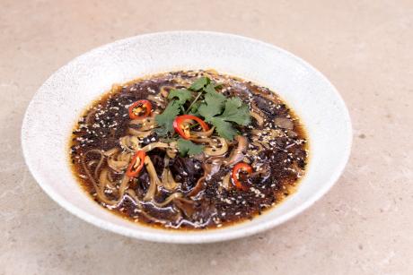 Бульйон на основі білих грибів, гриби шиїтаке, гливи, гриби муер, рисова локшина, кінза, кунжут