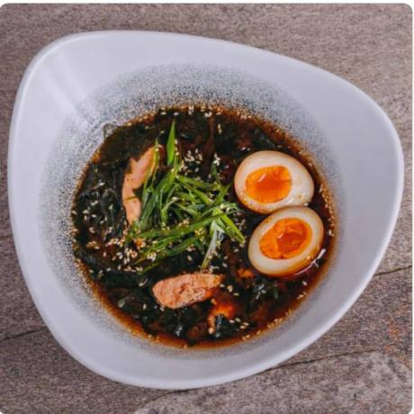 - Інгредієнти: Водорості вакаме, лосось, паста місо, хондаші, мариноване куряче яйце, соєвий соус, цибуля зелена, кунжут.