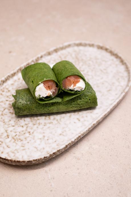 Запечений омлет з трьох яєць, козиний сир, смажена цибуля порей, шпинат бебі.