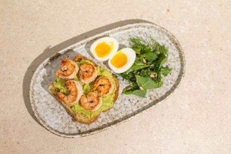 Мультизерновий хліб, обсмажений на вершковому маслі, тигрові креветки, гуакамоле, спілий авокадо, мікс зелені з насінням та пікантним соусом понзу, яйце 5-ти хвилинка