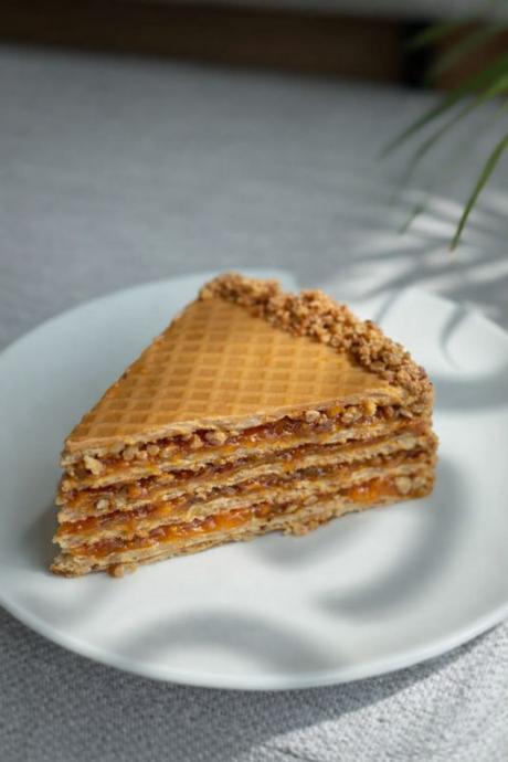 Вафельні коржі, варене згущене молоко власного виробництва, вершкове масло, абрикосовий джем та смажені волоські горіхи.