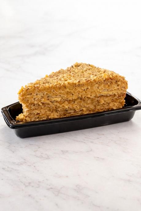Вафельні коржі, варене згущене молоко власного виробництва, вершкове масло, абрикосовий джем та смажені волоські горіхи.
